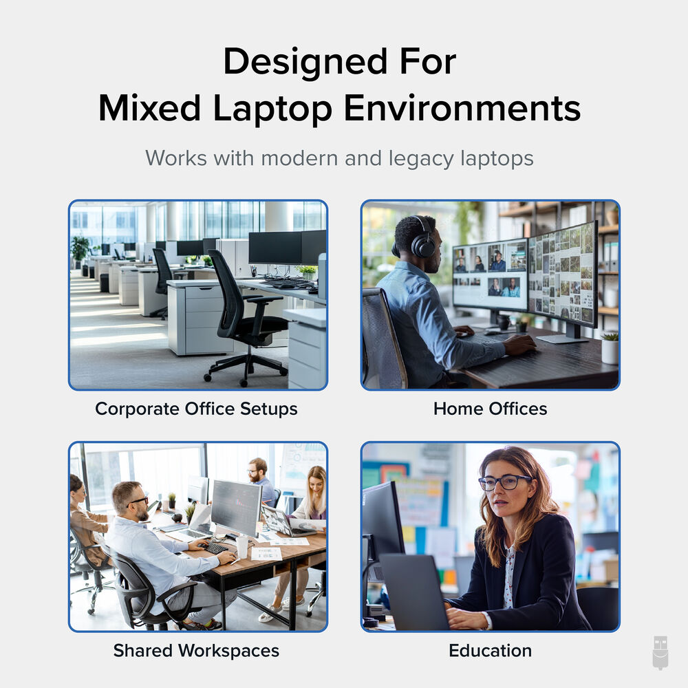 Plugable. Эта док-станция, предназначенная для расширения или зеркального отображения контента с экрана ноутбука, оснащена выходами HDMI и DVI, а также поддерживает подключения VGA с помощью входящего в комплект адаптера. Подключаясь к ноутбуку через штекер USB 3.1 Gen 1 Type-A, UD-3900 оснащен двумя портами USB 3.1 Gen 1 Type-A и четырьмя портами USB 2.0 для периферийных устройств и других аксессуаров. Также имеется порт RJ45 с поддержкой Gigabit Ethernet, а два отдельных разъема 1/8 дюйма обеспечивают микрофонный вход и аудиовыход.