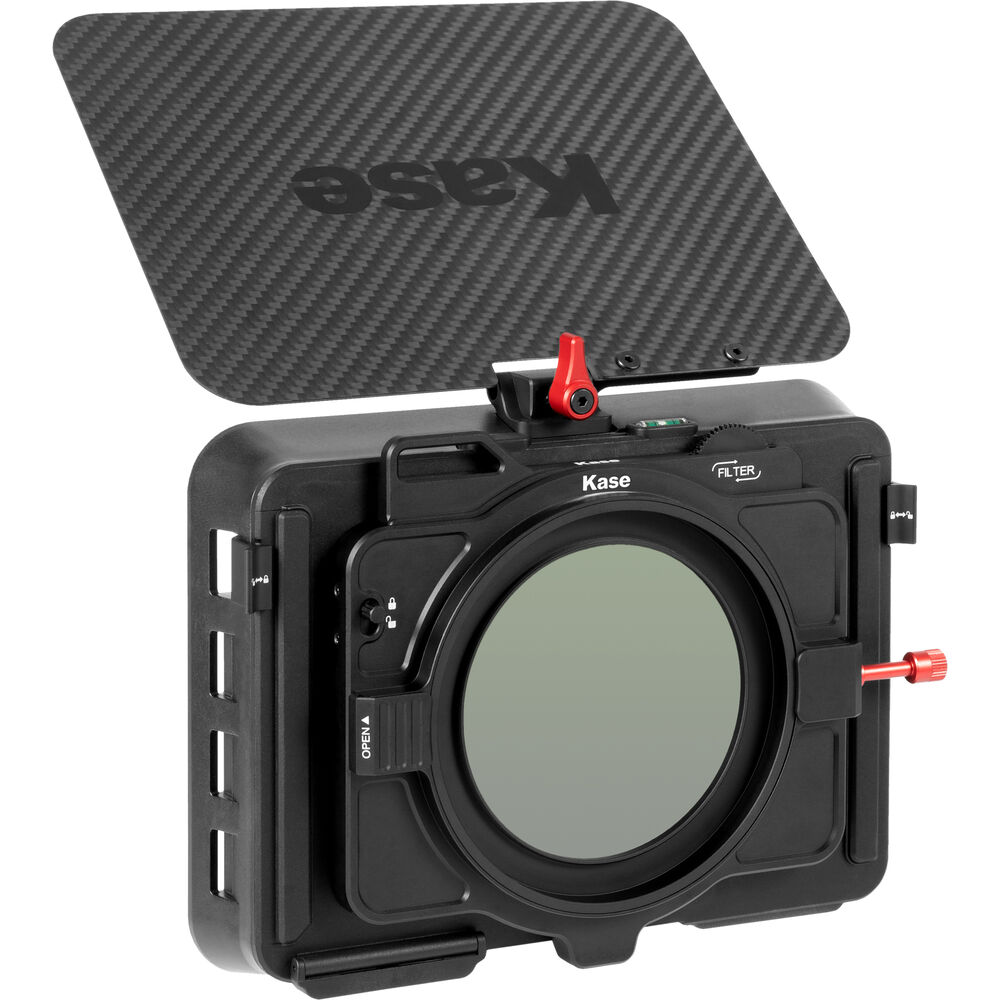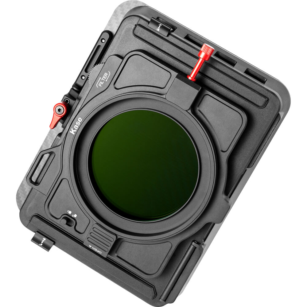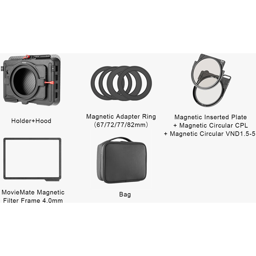 Kase MovieMate Magnetic Matte Box Holder V-ND Kit отличается интересным дизайном для пристегивающихся коробок для матов и позволяет устанавливать друг на друга комбинацию из пяти фильтров: два 4 x 5,65 дюйма и три круглых фильтра 95 мм. В комплект поставки входят фильтры весом чуть более 140 г без фильтров, совместимые с круглыми фильтрами диаметром 95 мм и ультратонкими фильтрами Kase 4 x 5,65 дюйма толщиной всего 1,1 мм, что делает его легким решением для ваших задач по фильтрации. Входящие в комплект магнитный фильтр CPL и магнитный круглый фильтр VND помещаются в держатель круглого фильтра диаметром 95 мм. В комплект входят фильтры с нейтральной плотностью 0,6 и градуированный фильтр с нейтральной плотностью 0,9.