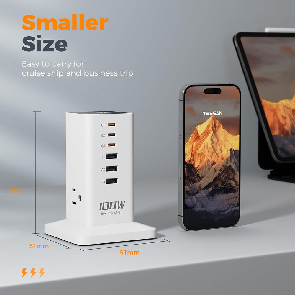 - Вертикальная зарядная станция Tessan 9-в-1 мощностью 100 Вт с USB/AC (белая)