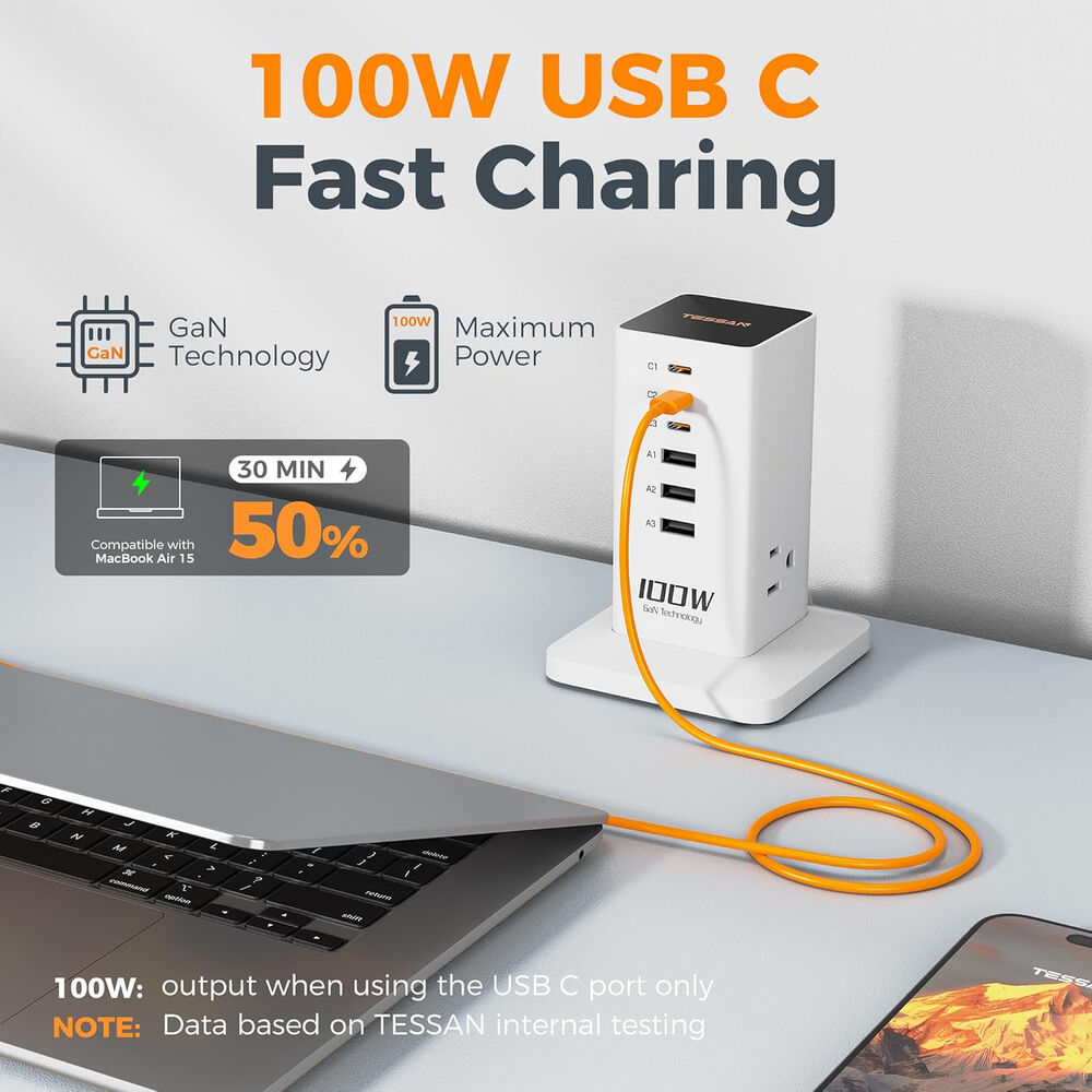 Tessan. Благодаря двум портам USB-C, четырем портам USB-A и трем 3-контактным розеткам переменного тока эта зарядная станция готова к любым устройствам: от телефонов и планшетов до энергоемких игровых ноутбуков. Через USB-порты ваши устройства смогут получать до 100 Вт общей выходной мощности, а общая мощность всех 9 выходов — до 1250 Вт. Благодаря технологии GaN тепловыделение снижается, а выходная мощность максимизируется. Кроме того, внутри предусмотрены динамические датчики температуры, которые помогут предотвратить повреждение электронных компонентов.