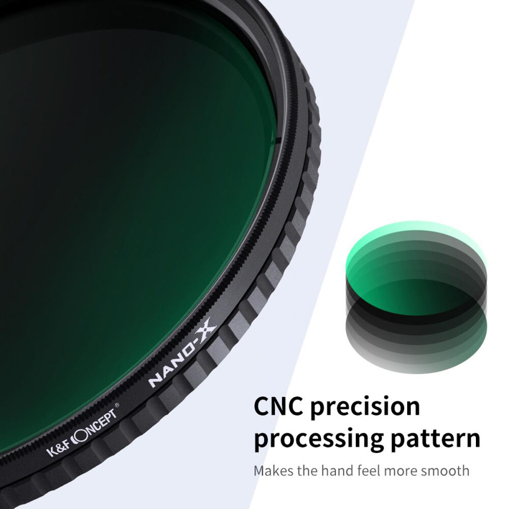 K&F Concept представляет собой 62-миллиметровый фильтр нейтральной плотности переменной плотности, обеспечивающий регулируемое ослабление света от 5 до 9 ступеней. Этот фильтр с многослойным покрытием уменьшает проникновение света и не влияет на цветность изображения. Обеспечивая больший контроль для длительной выдержки и размытия движения при изменении освещения, можно создавать динамичный вид водопадов, пейзажей и многого другого. Тонкая конструкция фильтра уменьшает возможное виньетирование, а технология K&F Peak позволяет избежать появления неудобного крестообразного элемента. Фильтр изготовлен из оптического стекла и оправы из алюминиевого сплава, имеет зеленое антибликовое покрытие, водонепроницаем, устойчив к воздействию масла и царапин.