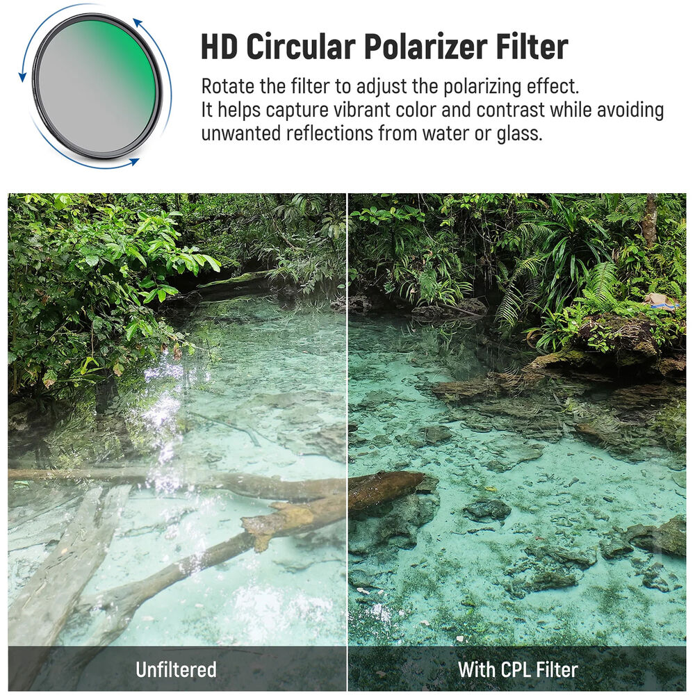 Neewer предоставляет вам набор базовых фильтров, которые отлично подойдут тем, кто хочет получить больше от своих объективов. Оба фильтра имеют конструкцию из оптического стекла для долговечности и 30-слойное нанопокрытие для долговременного качества. Их сверхтонкие алюминиевые оправы также помогают предотвратить виньетирование даже на широкоугольных объективах, а нескользящий рисунок позволяет легко захватывать их для регулировки, установки или снятия. УФ-фильтр обеспечивает дополнительный уровень защиты без ущерба для пропускания света, помогая предотвратить повреждение объектива царапинами, пылью, грязью и водой. Фильтр CPL обеспечивает больший контроль над поляризованным светом на изображениях, позволяя уменьшать или усиливать контрастность, вращая фильтр до достижения желаемого эффекта. Это означает, что вы можете устранить отражения на неметаллических поверхностях, таких как вода или стекло, или улучшить цвет неба и облаков.
