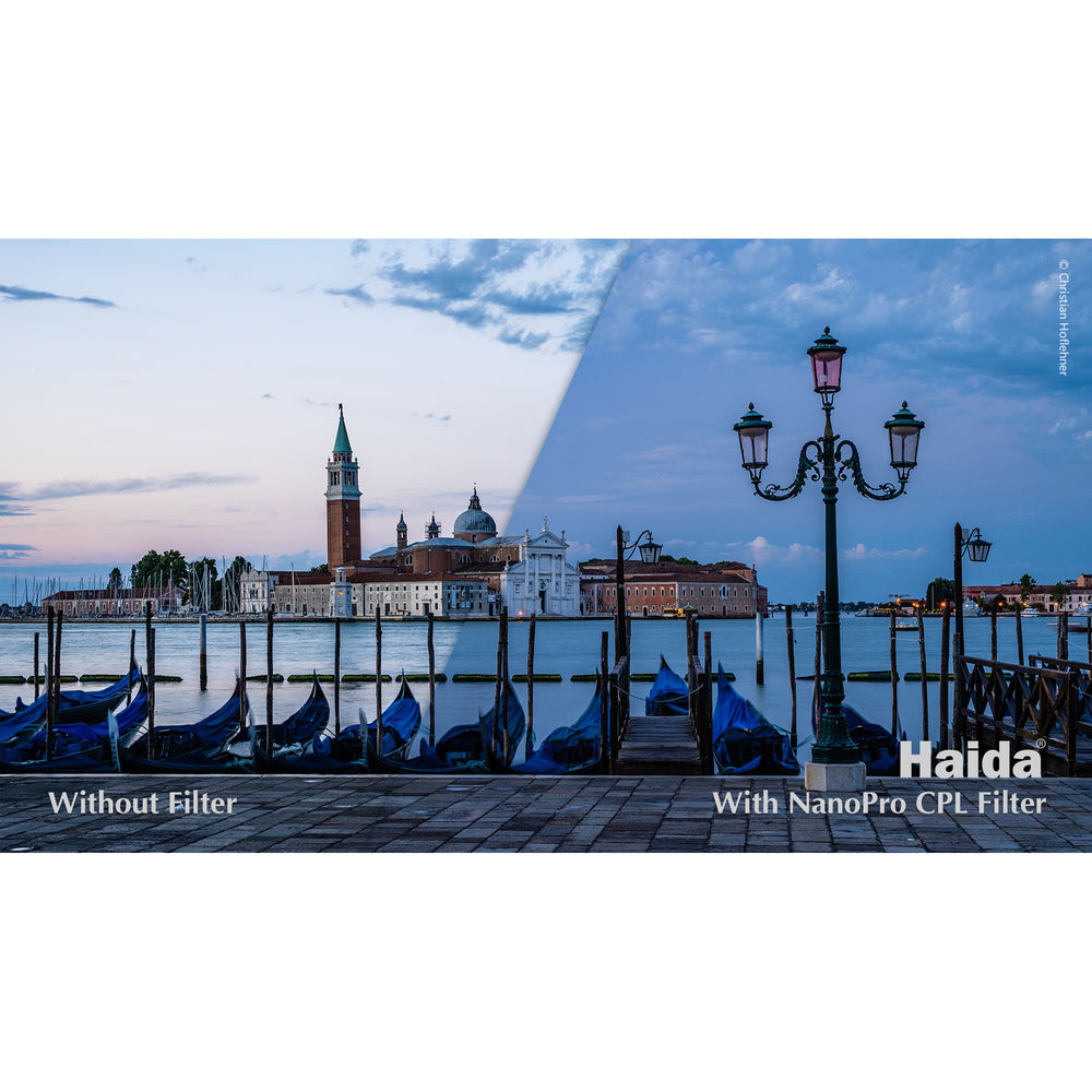 Haida помогает уменьшить отражения и блики, отфильтровывая свет, который стал поляризованным из-за отражения от неметаллической поверхности. Свет от солнца естественным образом становится частично поляризованным из-за отражения от электронов в молекулах воздуха, в результате чего свет рассеивается и превращается в то, что выглядит как дымка. Поляризационный фильтр направляет и фильтрует этот направленно поляризованный свет перпендикулярно отраженному, что позволяет поглощать большую его часть. Это приводит к заметному уменьшению бликов и отражений от неметаллических поверхностей, а также к повышению насыщенности неба и листвы.