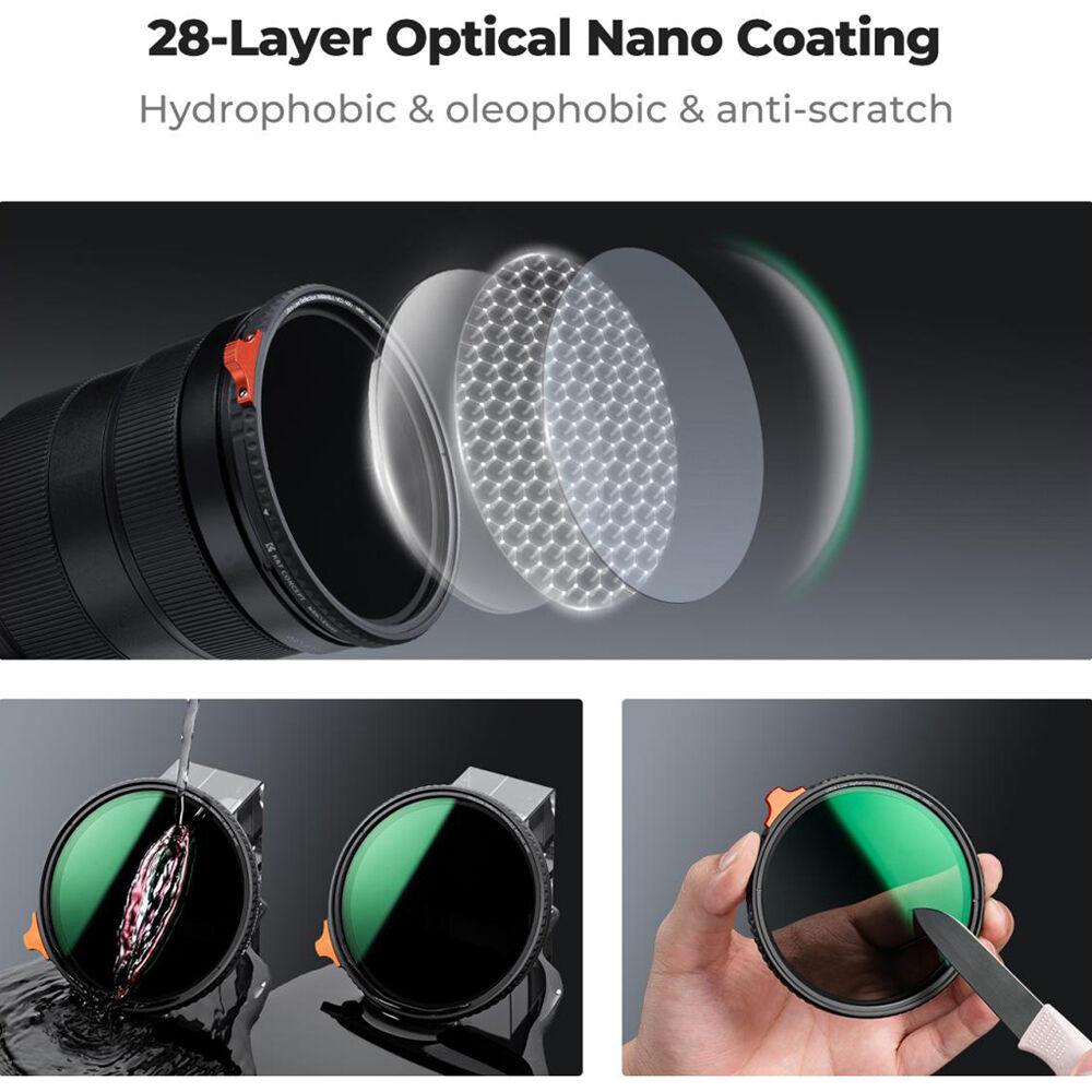 K&F Concept обеспечивает снижение освещенности на 1–9 ступеней и эффективно подавляет ореолы и блики. При съемке подсвеченных или ярких сцен этот фильтр обеспечивает четкое качество изображения. Он равномерно затемняет все изображение, что позволяет делать фотографии с более широкой диафрагмой или более длинной выдержкой без передержки. Прочная конструкция из оптического стекла имеет 28-слойное многослойное покрытие, которое делает его водонепроницаемым, пылезащитным и устойчивым к царапинам. Фильтр изготовлен из алюминия и оснащен поворотным кольцом с рычажком, что обеспечивает плавную регулировку при фото- и видеосъемке. Тонкий профиль фильтра предотвращает виньетирование при съемке широкоугольными объективами. Обратите внимание, что этот фильтр не подходит для использования с блендой объектива.