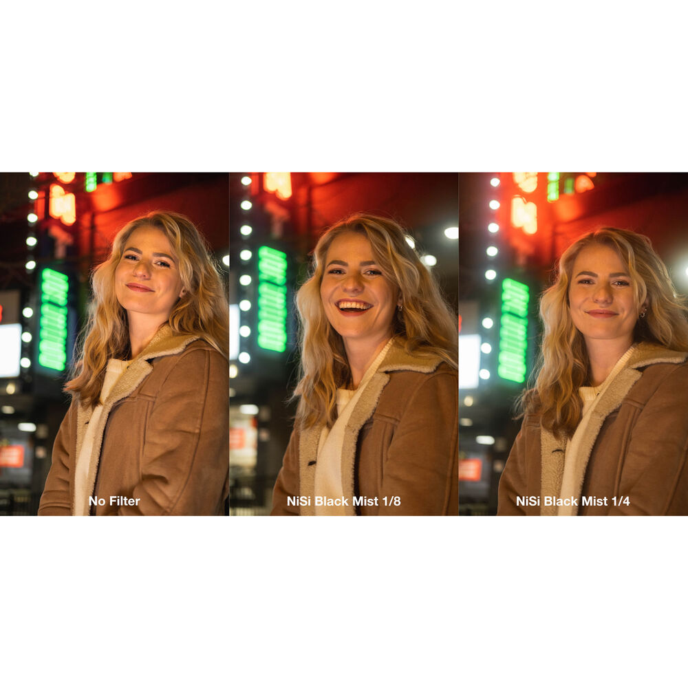 NiSi можно использовать для создания кинематографического вида путем снижения контрастности и бликов в кадре, чтобы сбалансировать тональный диапазон между светлыми участками и тенями. Фильтры диффузии Black Mist также обычно используются для смягчения морщин и пятен и создания привлекательного изображения объекта. Black Mist подавляет блики и поднимает тени для хорошо сбалансированного контраста. Источники света создают яркий центр с приятным свечением. Помимо портретной съемки, фильтры Черный туман можно использовать и в других областях, например, в ночной съемке, пейзажной съемке и натюрмортах, чтобы создать кинематографическую атмосферу, добавляя дополнительное свечение и градиенты к светлым участкам сцены. Любой прямой источник света придаст снимкам более гладкую, маслянистую текстуру вокруг светлых участков.