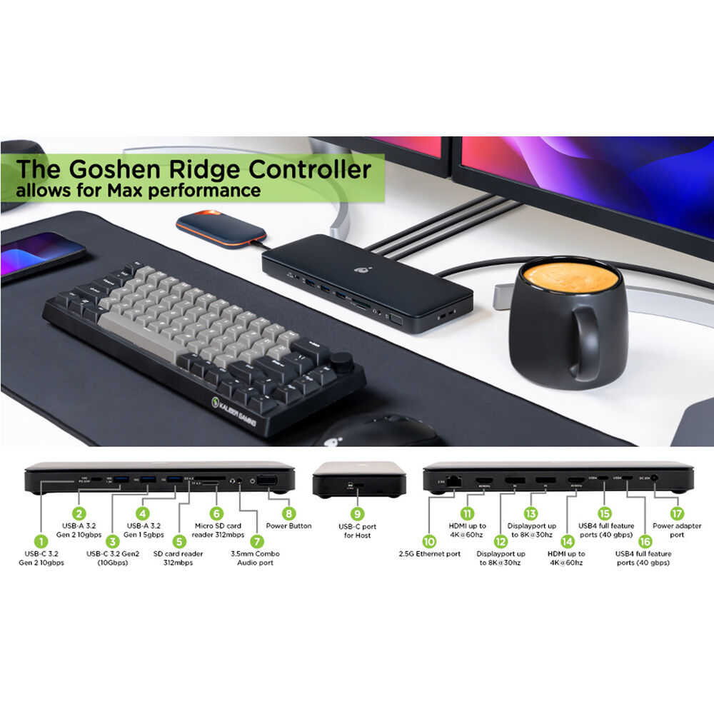 IOGEAR, разработанная для пользователей, желающих расширить возможности своей системы USB4 или Thunderbolt 4, совместима с Windows и Mac. Она подключается к вашей системе через порт USB4/USB-C со скоростью 40 Гбит/с, обеспечивая мощность до 96 Вт. Сама док-станция питается от входящего в комплект адаптера переменного тока мощностью 150 Вт. Также имеются два порта USB4/USB-C 40 Гбит/с с поддержкой 8K/30 Гц, порт USB-C 3.2 Gen 2 10 Гбит/с мощностью до 30 Вт, два порта USB-A 3.2 Gen 2 10 Гбит/с, один порт USB-A 3.2 Gen 1 5 Гбит/с, порт 2,5 Gigabit Ethernet, комбинированный аудиоразъем 3,5 мм, картридер SD UHS-II и картридер microSD UHS-II. Также имеются два выхода HDMI 4K/60 Гц и два выхода DisplayPort 8K/30 Гц, что позволяет подключить к этой док-станции до трех дисплеев с разрешением 4K.