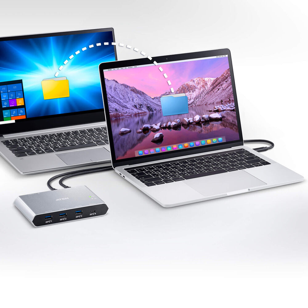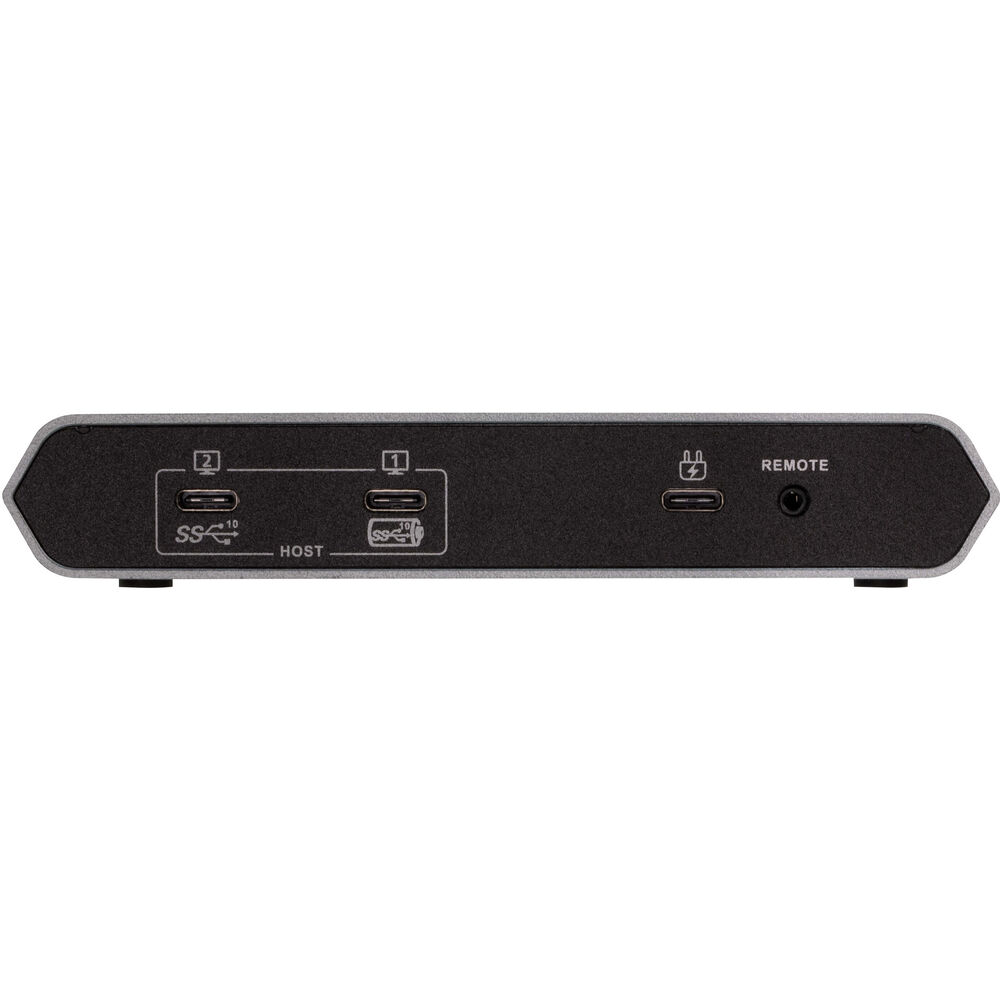 ATEN. Этот коммутатор, совместимый по технологии Plug-and-Play с компьютерами Windows и Mac, использует один порт USB 3.2 Gen 2 Type-C и три порта Type-A для двух хостов. С помощью кнопки выбора на пульте ДУ можно легко переключаться между хостами, а светодиодный индикатор оповещает о текущем активном подключении. Также имеется порт USB Type-C с функцией сквозного питания, поддерживающий профили питания 5, 9, 15 и 20 В. Кроме того, этот порт может обеспечивать мощность до 85 Вт при использовании с дополнительным адаптером питания. Коммутатор ATEN US3342 в алюминиевом корпусе оснащен защитой от перегрузки по току. В комплект входят два кабеля USB 3.2 Gen 2 Type-C длиной 3,3 дюйма.