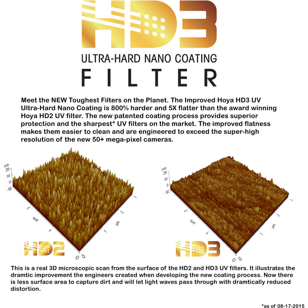 УФ-фильтр Hoya 55 мм HD3 — это прозрачный фильтр общего назначения, предназначенный для поглощения ультрафиолетового света и уменьшения синеватого оттенка дневного света. Помимо уменьшения нежелательного синего оттенка, не создается никакого дополнительного окрашивания или контраста, и при использовании этого фильтра не требуется корректировка экспозиции. Для предотвращения внутренних ореолов и отражений, обеспечивая светопропускание более 99,7%, на каждую сторону нанесено 16 слоев антибликового нанопокрытия. В общей сложности 32 слоя обеспечивают высокую степень защиты основы фильтра и помогают ей оставаться чистой дольше, чем фильтры без покрытия. Формула нанопокрытия, используемая в УФ-фильтрах HD3, обеспечивает улучшенный эффект каплеобразования при контакте с водой, что повышает эффективность очистки, а также эффективно удаляет жир и пятна.
