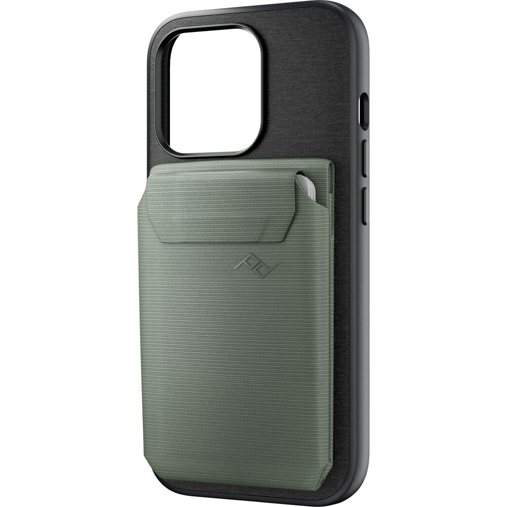 Peak Design. Этот тонкий чехол шалфейного цвета использует магнитное соединение SlimLink для крепления к совместимым чехлам Peak Design. Он также работает с устройствами MagSafe и универсальным адаптером Peak Design. Мощные неодимовые магниты обеспечивают надежное соединение, безопасное для карт и большинства гостиничных ключей. Кошелек также можно использовать как подставку для телефона благодаря полностью регулируемому, точно настроенному фрикционному шарниру. Просто отделите отделение для карт от магнитного и используйте телефон в портретной или альбомной ориентации. В качестве кошелька откройте магнитный клапан и вставьте до 7 карт. Клапан также служит язычком, что обеспечивает легкий доступ к картам при необходимости.
