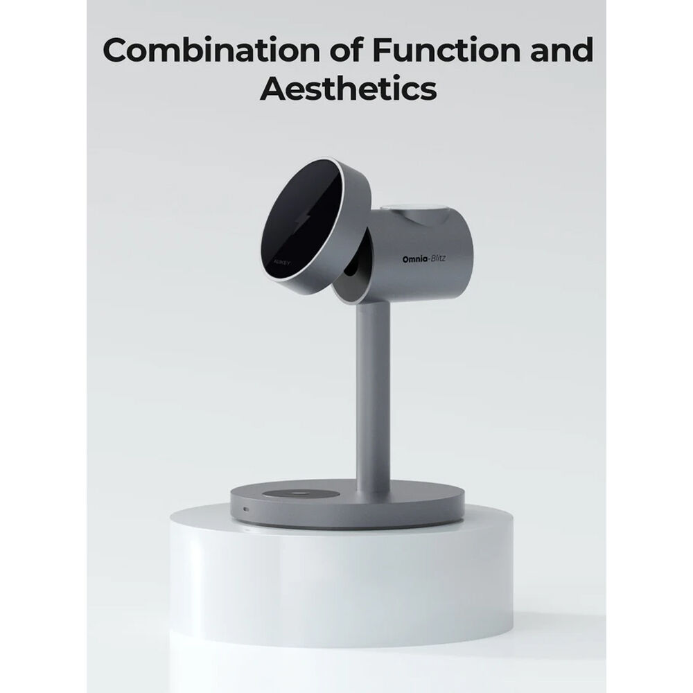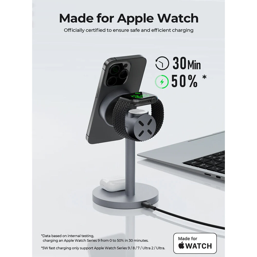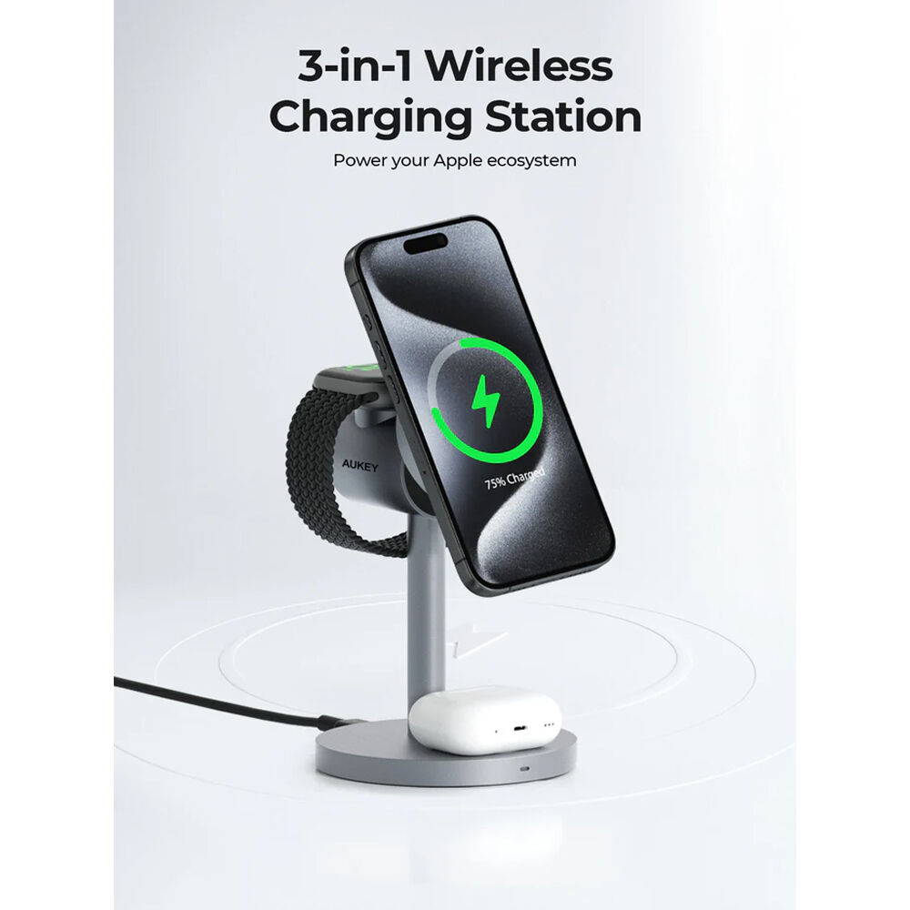 AUKEY. Эта усовершенствованная зарядная станция оснащена прочной металлической подставкой с цилиндрическим зарядным устройством, установленным сверху. Лицевая сторона зарядного устройства оснащена элегантным магнитным креплением из закаленного стекла, сертифицированным по стандарту Qi2 и обеспечивающим выходную мощность до 15 Вт для вашего совместимого телефона. На задней панели расположена встроенная зарядная панель с сертификатом MFW, специально разработанная для Apple Watch, с выходной мощностью до 5 Вт. Чехол для AirPods дополняет трио с собственной панелью, встроенной в основание подставки. Помимо технологии беспроводной зарядки, внутри корпуса находится активная система охлаждения и электрическое оборудование для защиты ваших устройств во время зарядки.