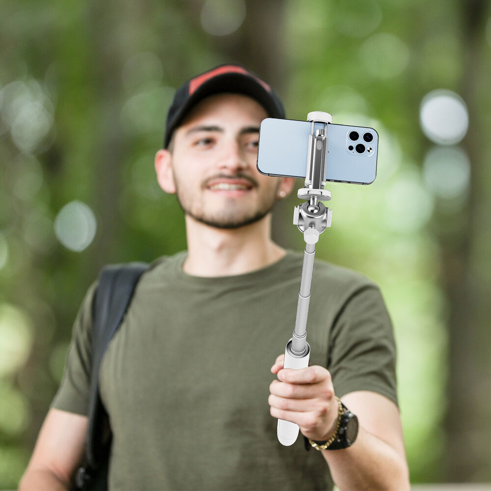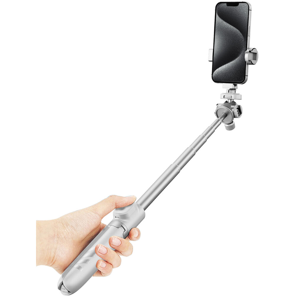 KraftGeek можно использовать как селфи-палку, так и штатив. В зависимости от ваших потребностей в съемке его высоту можно регулировать от 11 до 42 дюймов, а выдвижные ножки складываются из корпуса и позволяют стоять вертикально без пользователя Поддержка. Два встроенных крепления холодный башмак слева и справа на корпусе позволяют устанавливать совместимые аксессуары, такие как микрофоны или осветительные приборы, а винт с резьбой 1/4"-20 сверху позволяет прикрепить цифровую зеркальную камеру или прилагаемый держатель для телефона, который имеет дополнительное встроенное крепление холодный башмак. Встроенная шаровая головка позволяет использовать ее в портретном или альбомном режиме, а также создавать более креативные кадры благодаря наклону на ±145° и вращению на 360°. В комплект поставки входят Bluetooth-пульт дистанционного управления с радиусом действия 10,5 м и кабель micro-USB для зарядки.