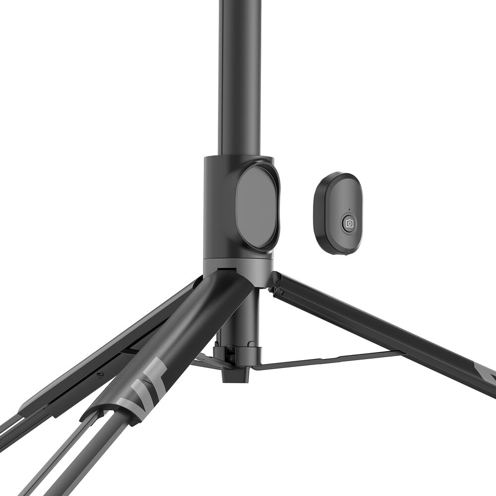 KraftGeek может использоваться как селфи-палка, так и штатив. В зависимости от ваших потребностей в съемке ее высота может регулироваться от 11 до 58 дюймов, а выдвижные ножки складываются из корпуса и позволяют стоять вертикально без пользователя Поддержка. Два встроенных крепления холодный башмак слева и справа на корпусе позволяют устанавливать совместимые аксессуары, такие как микрофоны или осветительные приборы, а винт с резьбой 1/4"-20 сверху позволяет прикрепить цифровую зеркальную камеру или прилагаемый держатель для телефона, который имеет дополнительное встроенное крепление холодный башмак. Встроенная шаровая головка позволяет использовать ее в портретном или альбомном режиме, а также создавать более креативные кадры благодаря наклону на ±145° и вращению на 360°. В комплект поставки входят Bluetooth-пульт дистанционного управления с радиусом действия 10 метров и кабель micro-USB для зарядки.
