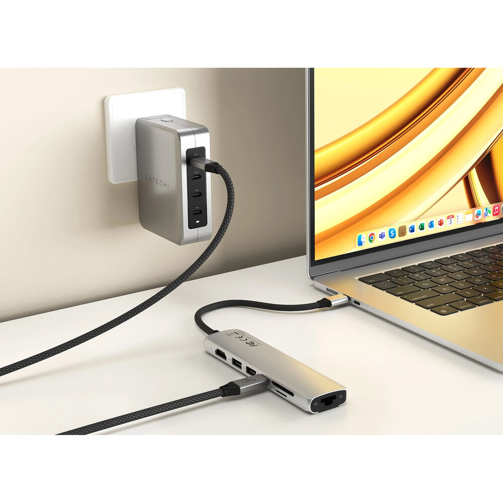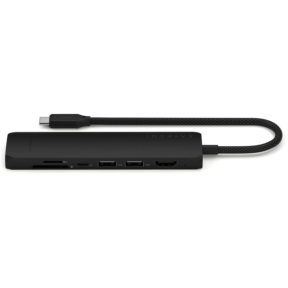 Satechi. Благодаря элегантному черному алюминиевому корпусу и оплетенному кабелю USB-C 3.2 Gen 2 для подключения к компьютеру, этот концентратор легко и удобно брать с собой куда угодно благодаря прочности и компактному форм-фактору. Благодаря одному порту USB-C PD с входной мощностью до 100 Вт и выходной мощностью 80 Вт для зарядки устройств, двум портам USB-A 3.2 Gen 2 со скоростью до 10 Гбит/с, одному кардридеру Micro/SD со скоростью чтения до 104 МБ/с и одному порту Gigabit Ethernet со скоростью 10/100/1000 Мбит/с, он обеспечивает бесперебойную передачу файлов, более высокую скорость сети и надежное соединение. Кроме того, встроенный порт HDMI позволяет выводить видео 4K на внешний монитор с частотой обновления 60 Гц. Компания Satechi разработала этот концентратор как полностью готовый к использованию, поэтому для его полной функциональности не требуется дополнительное программное обеспечение, а благодаря широкой совместимости с устройствами вы сможете использовать этот концентратор на множестве устройств.