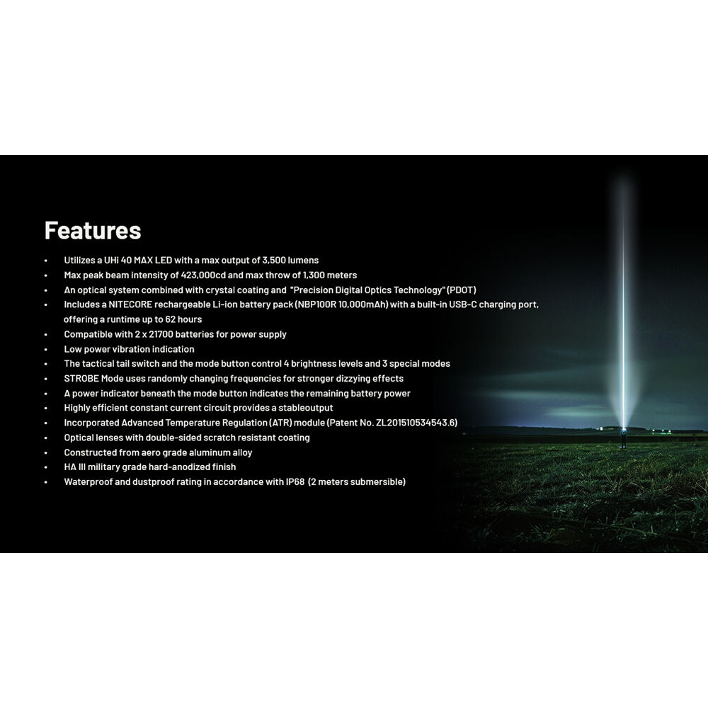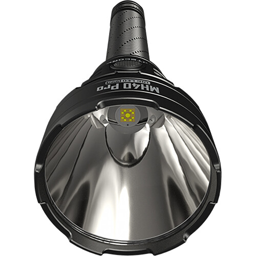 Работает на батарее 10 А, аккумуляторный светодиодный фонарик Nitecore MH40 Pro может обеспечивать яркий световой поток 3500 люмен и дальность освещения составляет более полумили. Помимо четырех уровней яркости, MH40 Pro оснащен дезориентирующим стробоскопом, режимом SOS и маяком-указателем местоположения. Переключатель включения/выключения расположен на задней крышке, а переключатель режимов — чуть ниже. Фонарь также можно управлять с помощью беспроводного пульта дистанционного управления, который поставляется с ремешками-липучками и креплениями на планку Пикатинни.