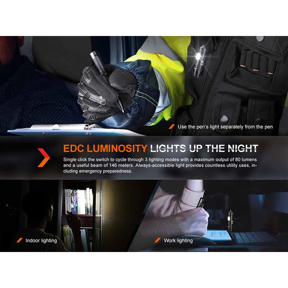 Тактический фонарь для повседневного ношения с выдвижным шариковым картриджем Schmidt, синий тактический фонарик-ручка Fenix T6 оснащен светодиодным фонарем, который излучает до 80 люмен и имеет три уровня яркости. Он имеет керамическую головку в верхней части, которую можно использовать в чрезвычайных ситуациях, когда нужно разбить стекло. Встроенный литий-полимерный аккумулятор емкостью 100 мАч позволяет свету светить до 26 часов при установке на минимальный уровень яркости и заряжается с помощью входящего в комплект кабеля USB-C для зарядки. Алюминиевый корпус фонарика защищен от пыли, брызг и ударов, что позволяет защитить его при падении с высоты до трех футов.