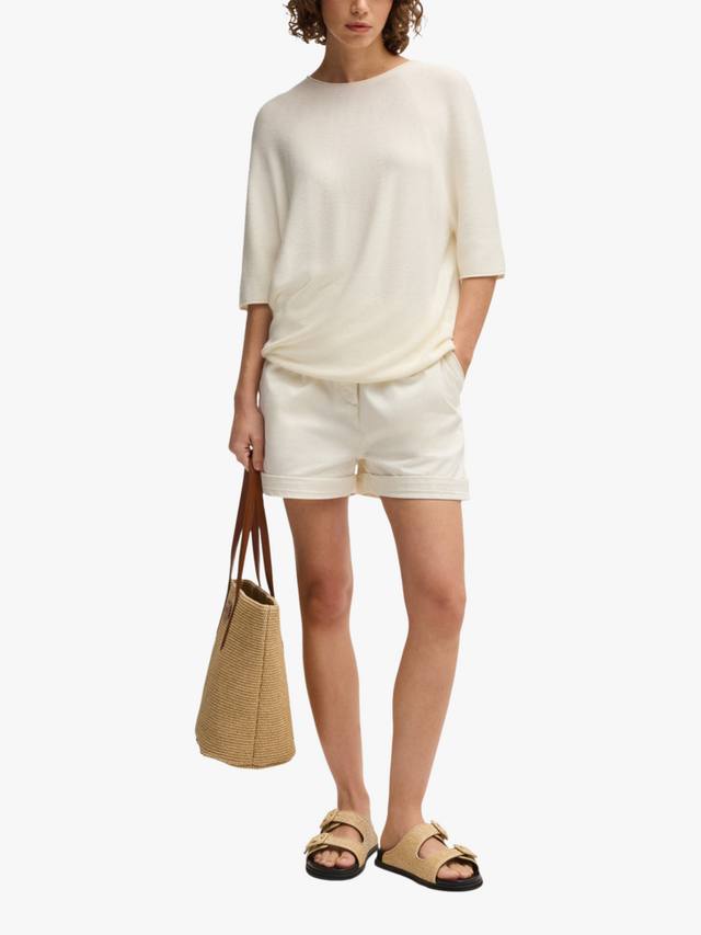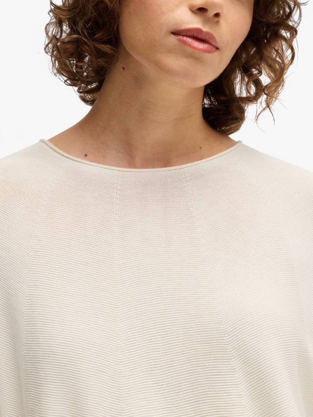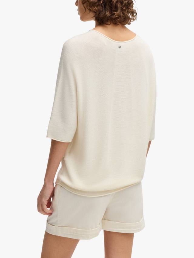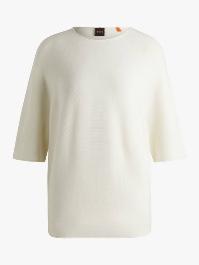 Этот трикотажный топ в рубчик от BOSS с круглым вырезом и рукавами до локтя станет отличным выбором в прохладную погоду.
