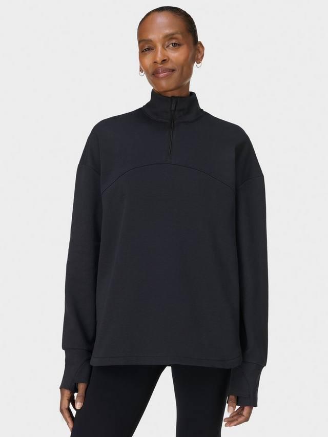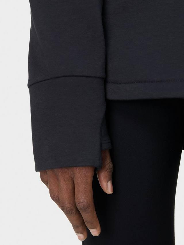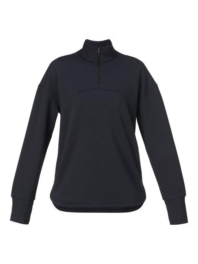 Полумолния для тренировок в студии и повседневного ношения. Ткань влагоотводящая, быстросохнущая, с подкладкой из мягкого флиса. Свободный удлиненный крой с закругленным подолом. Два потайных накладных кармана и отверстия для больших пальцев для дополнительной защиты. Светоотражающий логотип на спине.