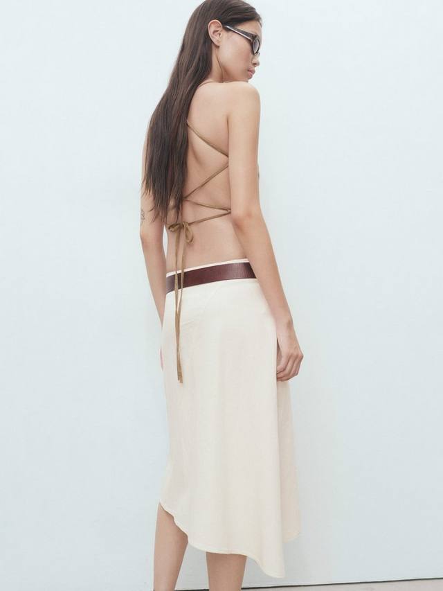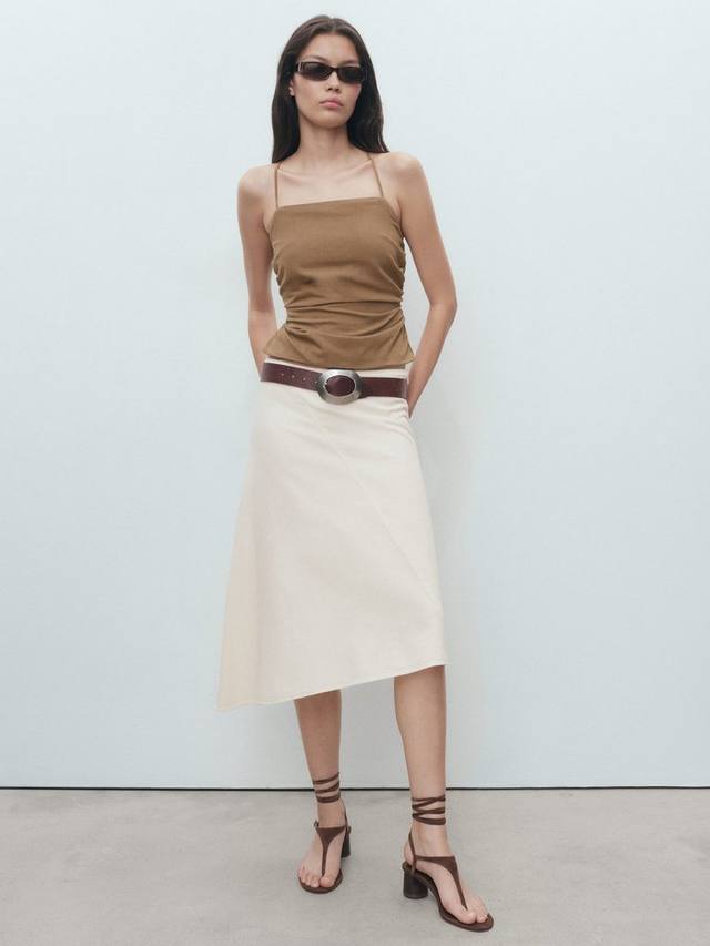 Эта юбка миди А-силуэта отличается продуманным асимметричным кроем и практичной застежкой-молнией, привнося комфорт и современный вид в ваш день. Смесь хлопка и льна дарит ощущение легкости и свежести, делая каждое ваше движение легким и естественным.