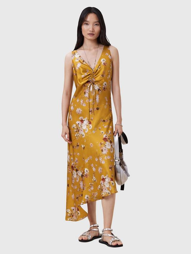 Это платье миди AllSaints сочетает в себе асимметричный силуэт с рюшами и мягкую шелковую ткань для воздухопроницаемого комфорта. V-образный вырез и отсутствие рукавов обеспечивают универсальность, а цветочный узор добавит индивидуальности как летним дням, так и вечерним встречам.