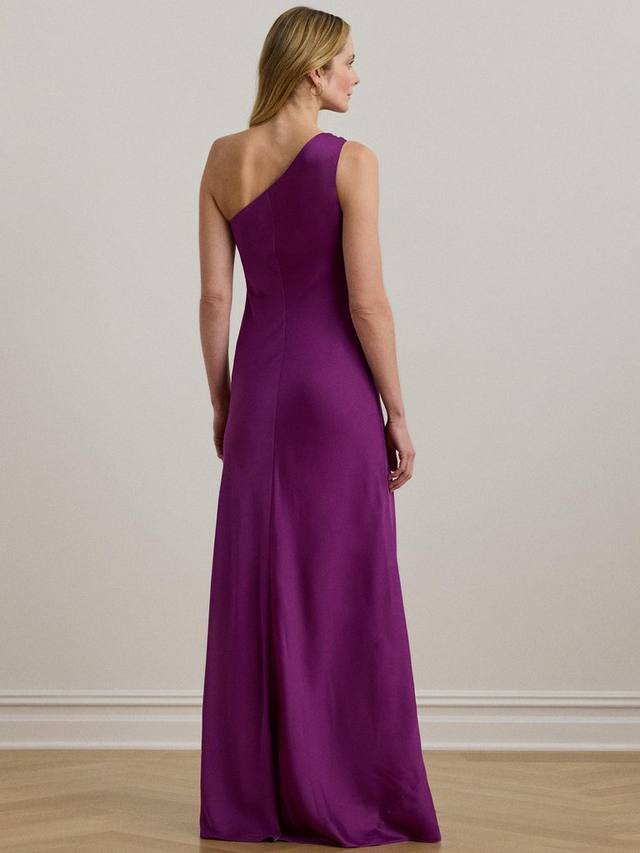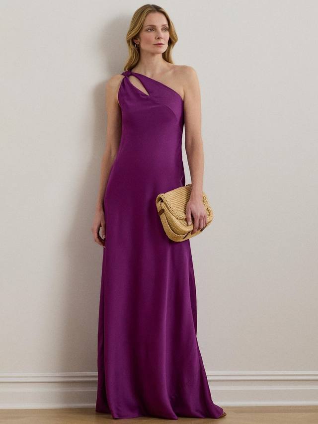 Это макси-платье от Lauren Ralph Lauren, эффектно ниспадающее до пола, асимметрично и с вырезом на плече, привлекающим внимание.