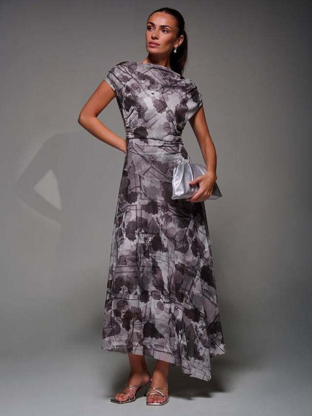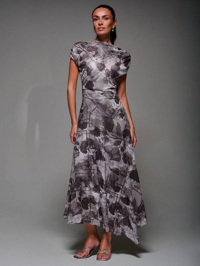 Асимметричное драпированное платье Midaxi с косым вырезом, плиссированными плечами и мягкими сборками на талии для мягкой драпировки. Заниженная линия талии и асимметричный подол сочетают в себе современную и вневременную элегантность для любого случая.