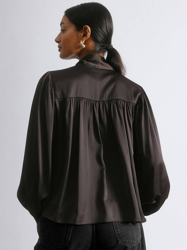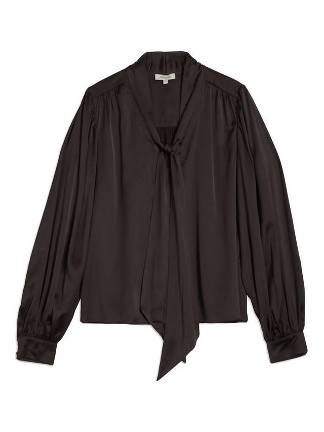 Эта стильная блузка выполнена из роскошного атласа. Рукава-блузон создают мягкий, струящийся силуэт, а V-образный вырез подчеркивает линию горловины. Регулируемый завязочный элемент на шее делает ее универсальной как для деловых, так и для повседневных случаев. Удобная и стильная, эта блузка станет отличным дополнением к вашему гардеробу.