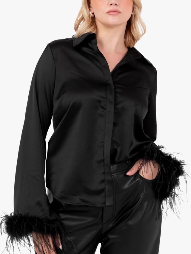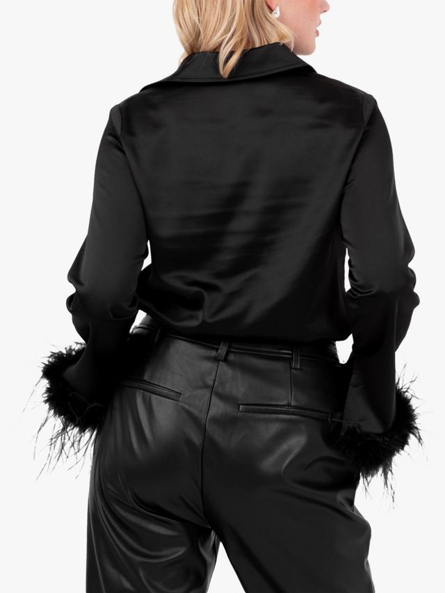 Эта атласная блузка с классической застежкой на пуговицы, элегантным верхним слоем на пуговицах и эффектными манжетами из перьев. Сочетайте с брюками и каблуками для создания элегантного образа или с юбкой-миди с запахом и пайетками для создания мерцающего вечернего образа.