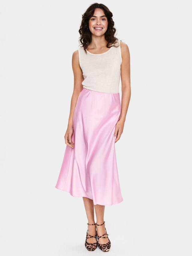 Юбка Disa — это элегантный и простой фасон, который можно носить с любым верхом. Она имеет среднюю посадку на талии со скрытым эластичным поясом и имеет струящийся А-образный крой. Юбка доходит до икр, а минимальное количество деталей делает ее подходящей для множества случаев.