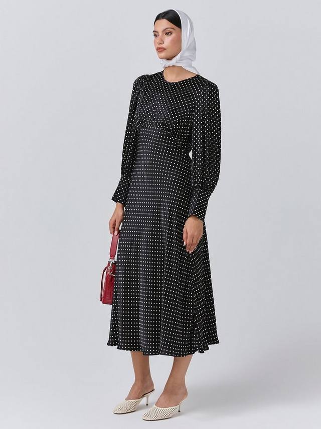 Изысканный стиль в лучшем виде: элегантное платье миди Fiona с косым кроем, которое будет уместно в самых разных ситуациях долгие годы. Простой круглый вырез горловины, длинные рукава с удлиненными манжетами и пуговицами, выгодный шов под грудью и выполнено из атласа с классическим принтом в горошек для максимального комфорта и износостойкости.