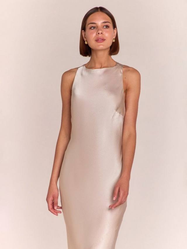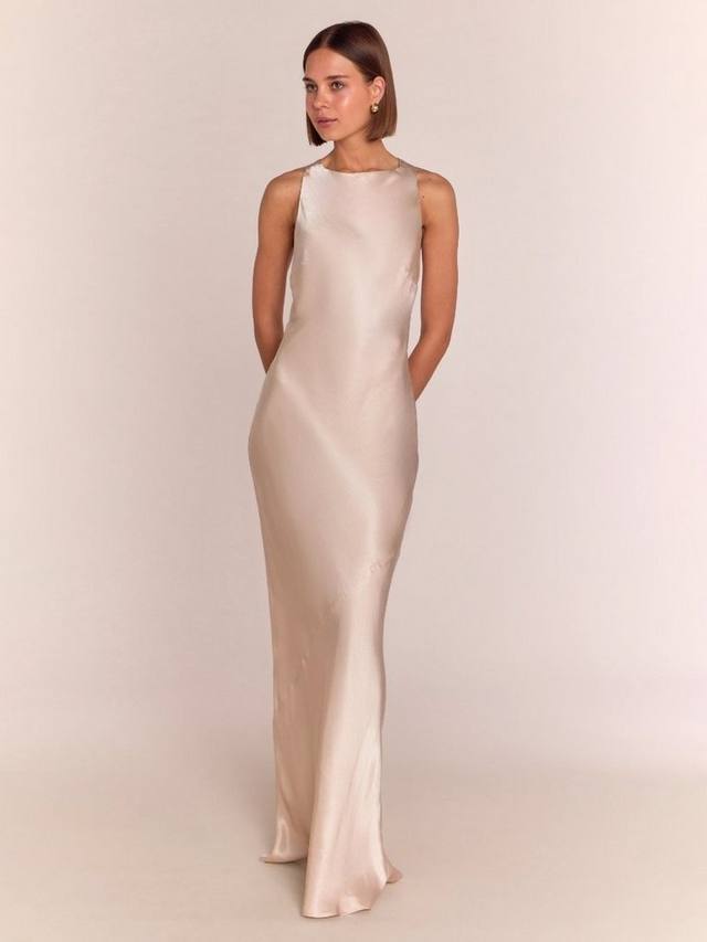 Это платье для подружек невесты с перекрещивающимися бретельками на спине (достаточно высоко, чтобы носить с низким бюстгальтером без бретелек), косой юбкой и прямым вырезом лодочка — именно то, что ваши девочки захотят носить снова и снова после свадьбы.