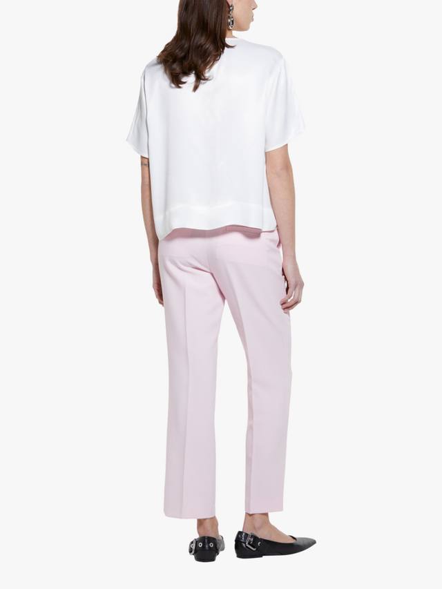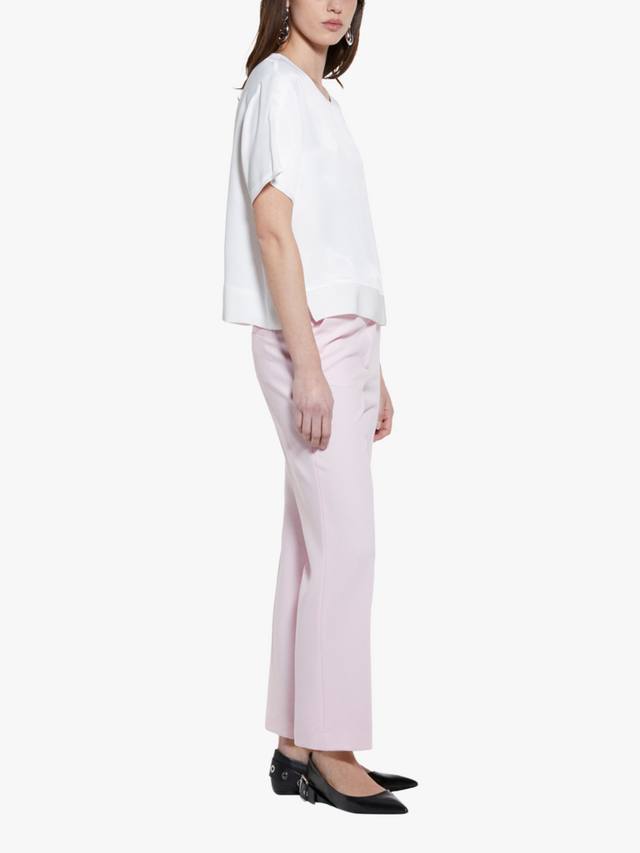 Блузка из вискозного атласа со вставкой из крепа на подоле спереди. Круглый вырез горловины, вырез-замочная скважина, застегивающийся на маленькую пуговицу сзади, короткие рукава с мягкими плечами и разрезами снизу.