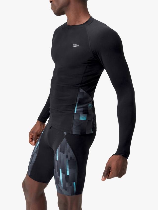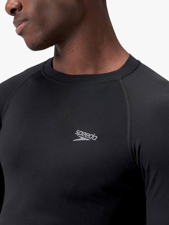 В любую погоду облегающий и надеваемый топ Speedo с длинным рукавом обеспечит вам защиту. Носите его как на пляже, так и во время катания на доске. Длинные рукава обеспечивают защиту в любую погоду. Плоские швы обеспечивают комфортное прилегание к коже. Ткань EnduraBrite растягивается в 4 направлениях и обладает свойством CREORA HighClo, что обеспечивает высокую устойчивость к хлору и превосходное сохранение формы.