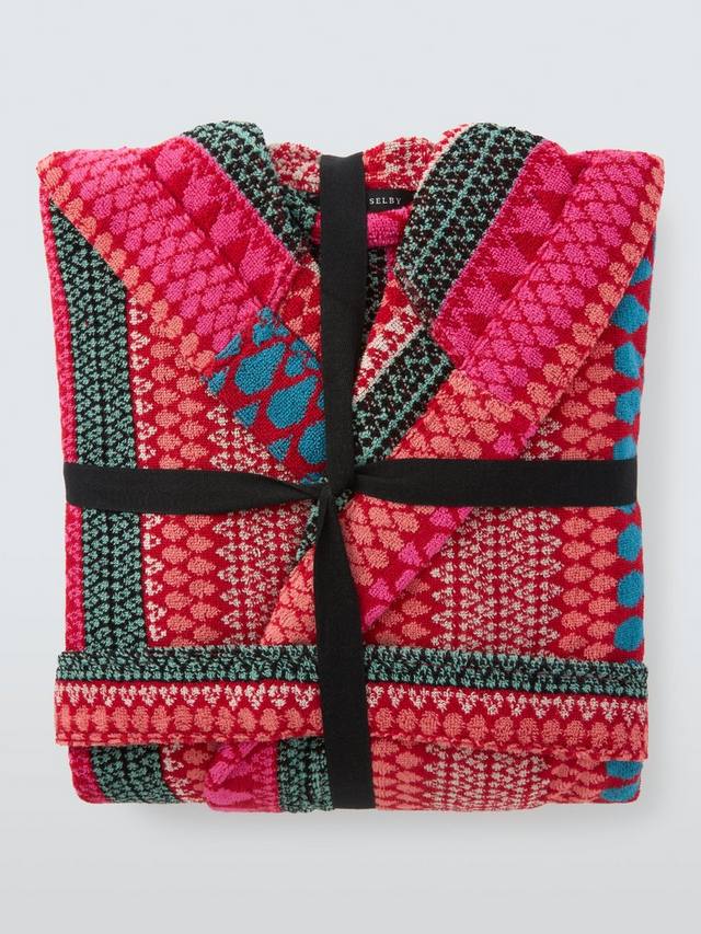 Уютный хлопковый халат от Margo Selby с узором Фавершем в красно-розовых тонах. Длинные петли делают его особенно мягким, а капюшон — ещё более уютным.