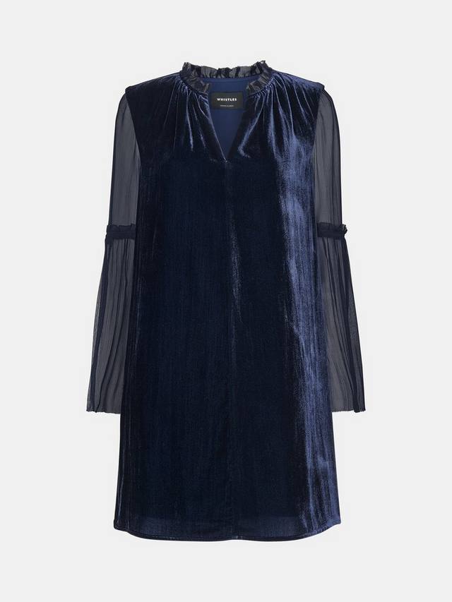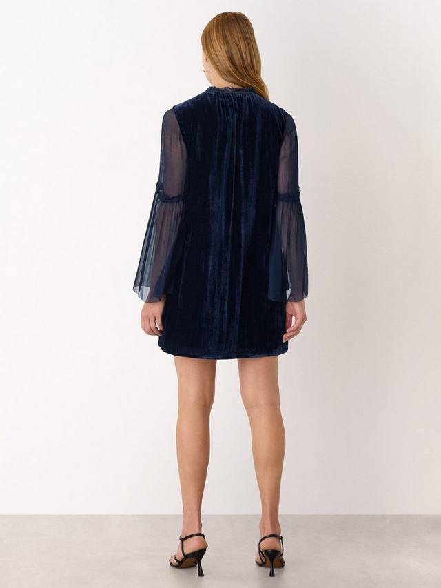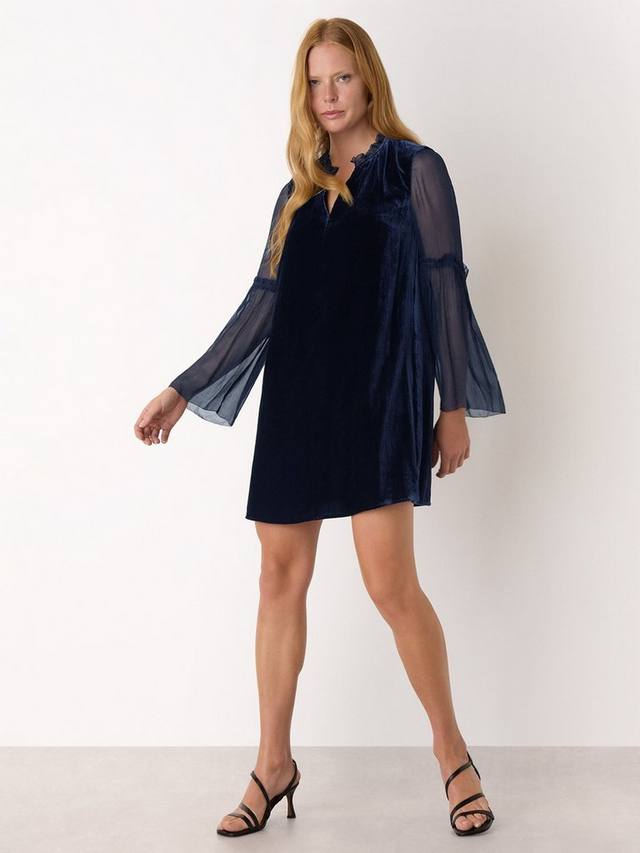 Короткое платье-трапеция из мягкого бархата. Свободный крой и V-образный вырез подчеркивают фигуру, а прозрачные длинные рукава обеспечивают комфорт. Платье изготовлено из экологичных волокон и легко сочетается с вашими любимыми аксессуарами.