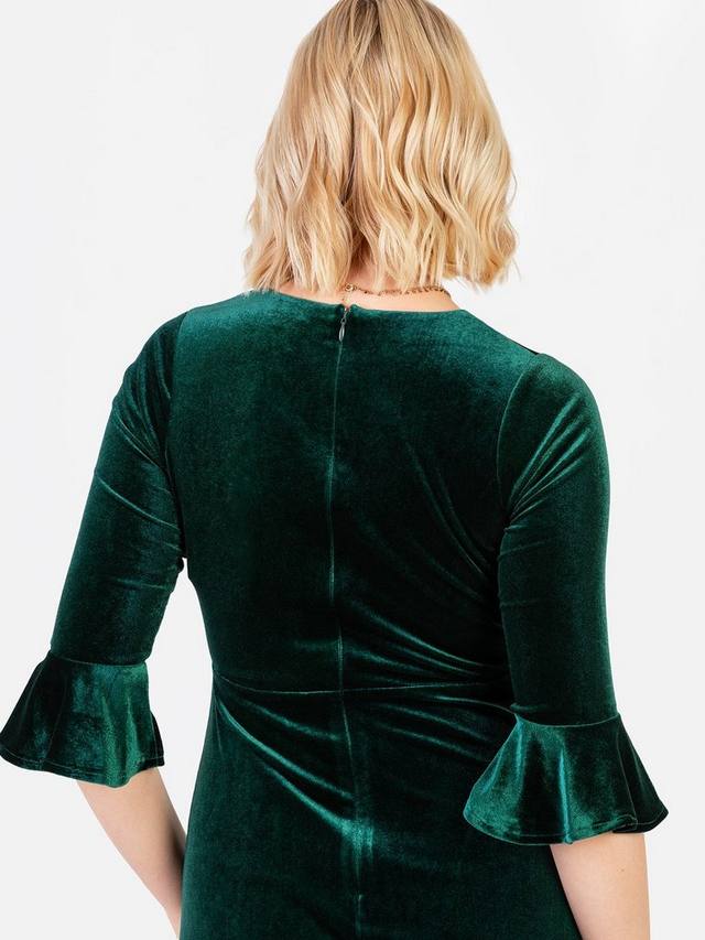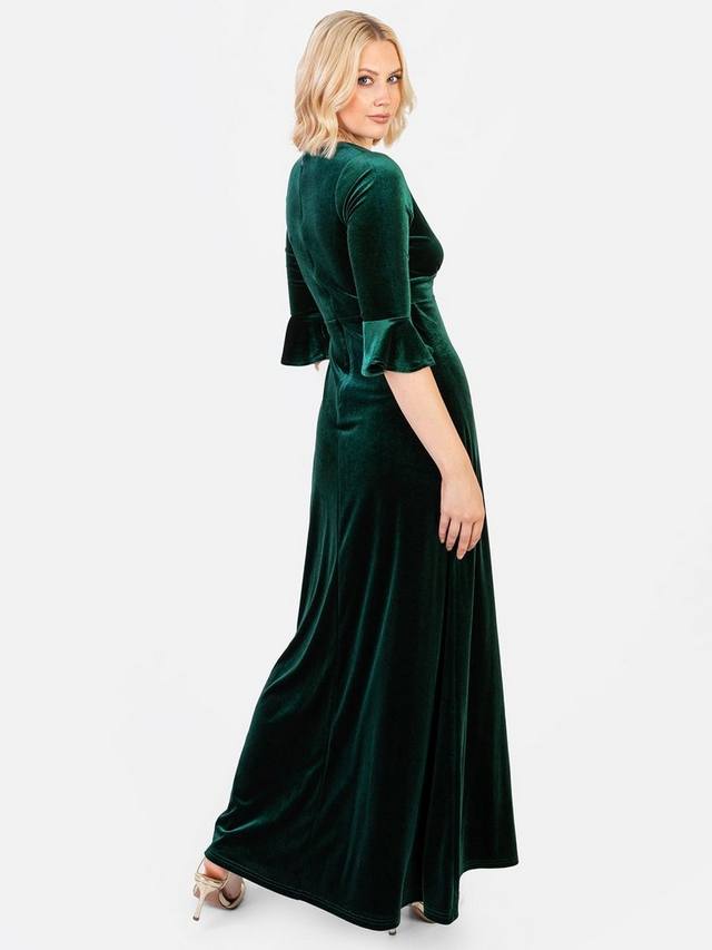 Это бархатное платье с V-образным вырезом на лифе, присборенной грудью и вставками на талии создает привлекательный А-образный силуэт. Элегантные рукава-фонарики 3/4 и струящийся А-образный макси с ниспадающим до пола подолом и разрезом на юбке обеспечивают элегантность и практичность.