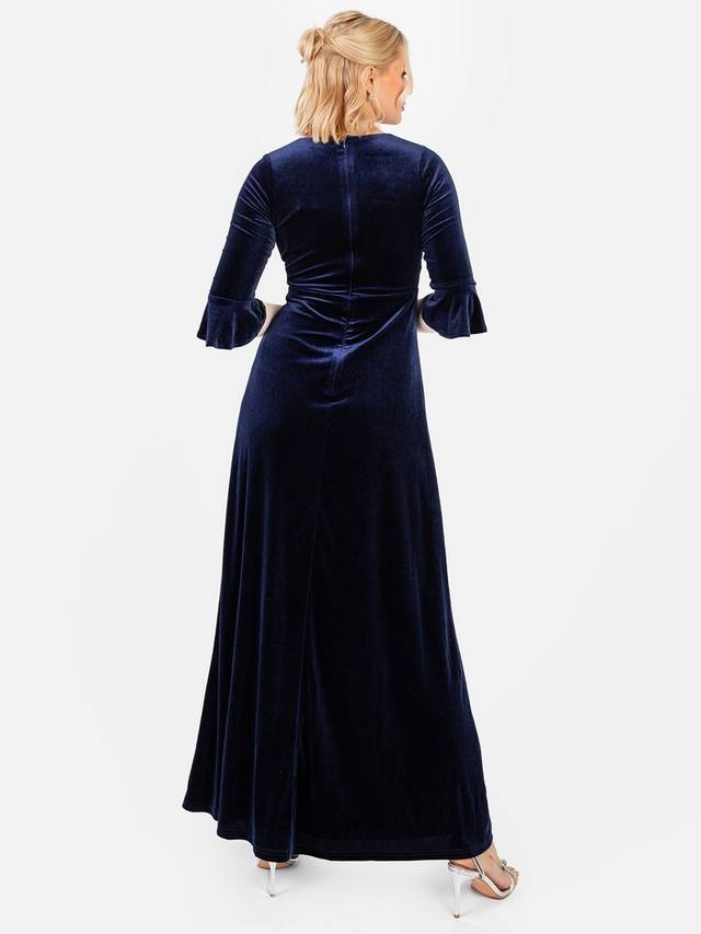 Это бархатное платье с V-образным вырезом на лифе, присборенной грудью и вставками на талии создает привлекательный А-образный силуэт. Элегантные рукава-фонарики 3/4 и струящийся А-образный макси с ниспадающим до пола подолом и разрезом на юбке обеспечивают элегантность и практичность.