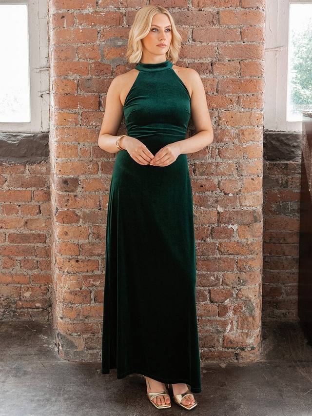Это платье из мягкого бархата сочетает в себе сдержанный гламур с элегантным халтер-воротом, который фиксируется элегантными завязками для идеальной посадки. Изящный вырез-капелька на спине добавляет очарования, а А-образный силуэт выгодно подчеркивает любую фигуру.
