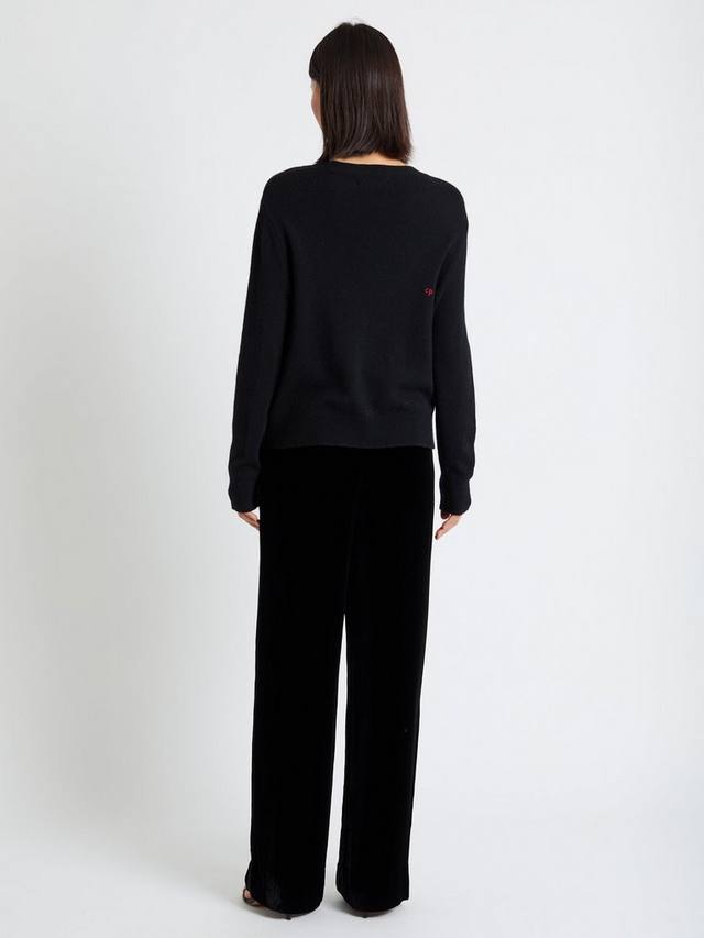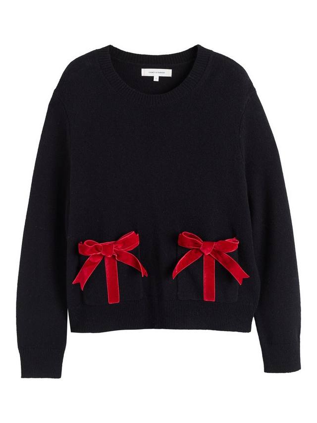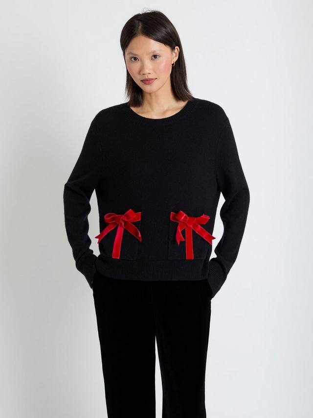 Самая нежная вязка сезона. Этот джемпер с круглым вырезом выполнен из нашей фирменной смеси шерсти и кашемира. Два передних кармана отделаны бантами из красного бархата — словно вы укутались в рождественский плед.
