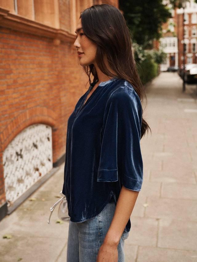Этот новый силуэт, выполненный из роскошного бархата, отличается привлекательным V-образным вырезом, струящимися рукавами-кейп и закругленным подолом, создающим элегантную драпировку. Этот универсальный фасон идеально сочетается с джинсами, создавая элегантный повседневный образ.