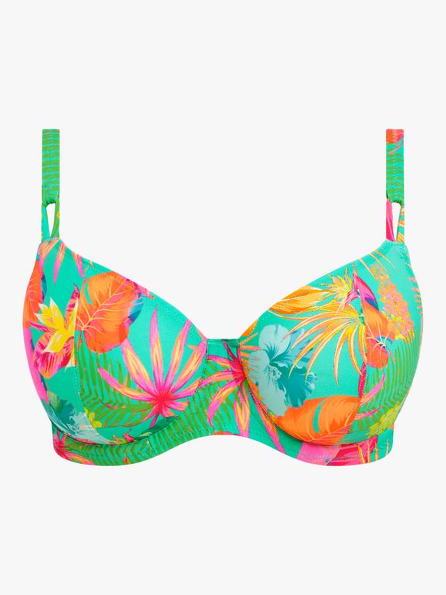 Яркие розовые оттенки встречаются с яркими апельсинами и манго на сочном нефритовом фоне, создавая идеальное тропическое сочетание. Бикини-топ с глубоким вырезом имеет соблазнительный глубокий вырез, закрывающий тело, чашечки на косточках для придания формы и поддержки, а также полностью регулируемые бретельки с петлями спереди.