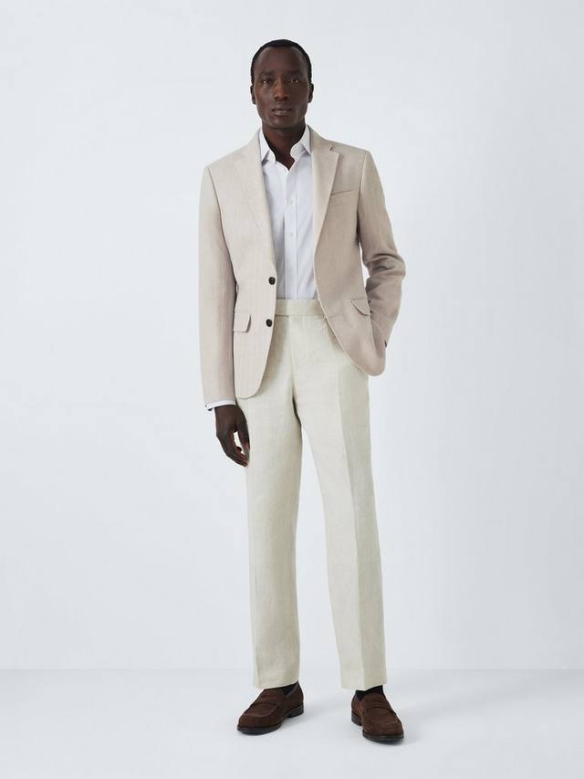 Однобортный пиджак из кремовой ткани с узором ёлочка, сшитый по нашей стандартной посадке. Кремовый узор ёлочка делает эту модель идеальной для летнего образа. Дополнен двумя передними карманами с клапанами.