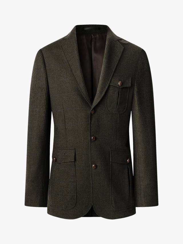 Этот пиджак выполнен из шерстяной смесовой ткани с тональным рисунком Price of Wales. Он застегивается на три пуговицы, имеет отложной воротник, манжеты на пуговицах и накладные карманы, а также воротник с застежкой на воротнике и ярко-зеленый нижний воротник.