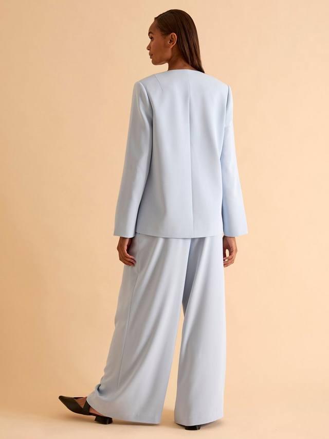 Этот блейзер без воротника с закругленным передом — современная интерпретация классического покроя.
