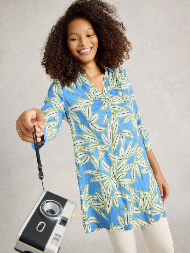 Легкая льняная туника с принтом. С элегантным воротником и рукавами три четверти.