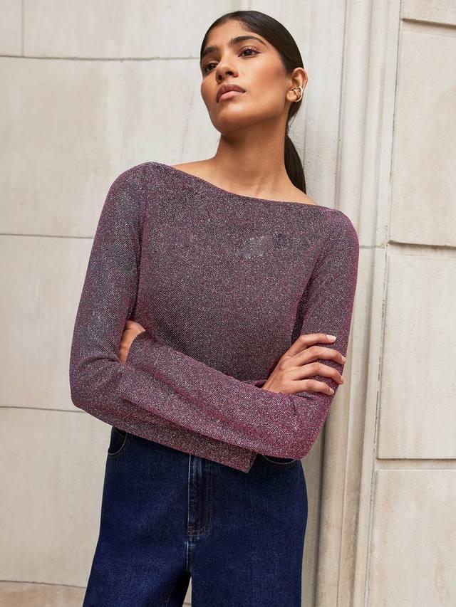 Блестящий топ от Ro&Zo с воротником-хомутом. Вырез лодочкой и длинные рукава дополнены сверкающими металлическими деталями. Идеальный вариант для веселых случаев.