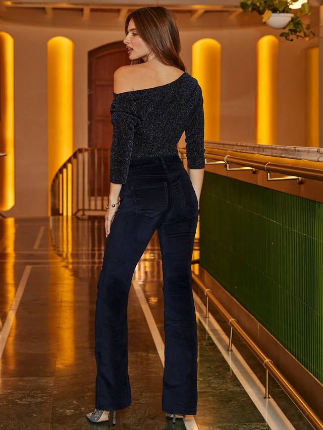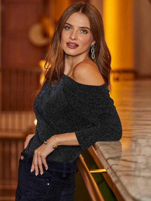 Легкая блузка от Sosandar. С открытыми плечами и рукавами три четверти, она украшена сверкающими металлическими деталями. Идеальный вариант для вечеров, наполненных весельем.