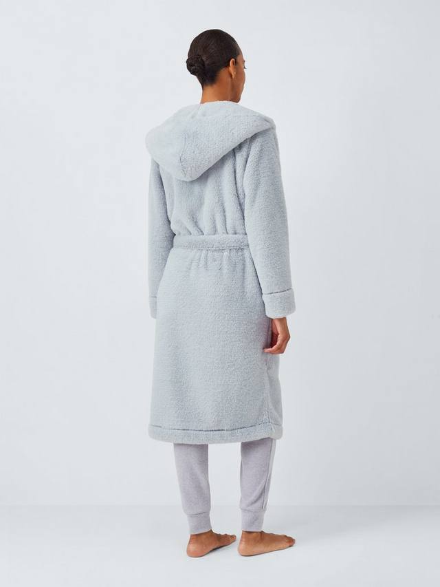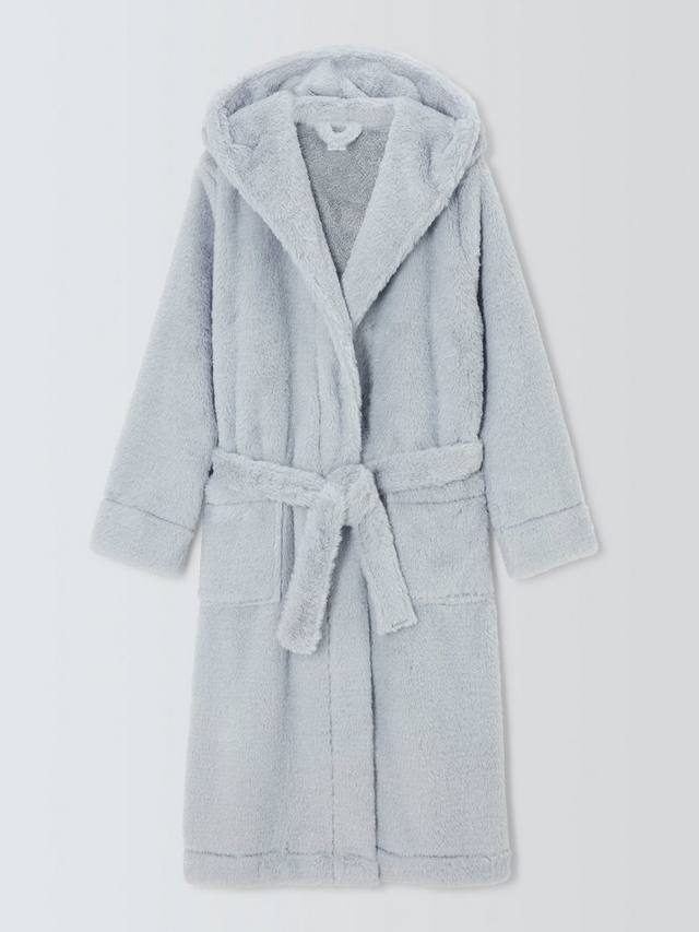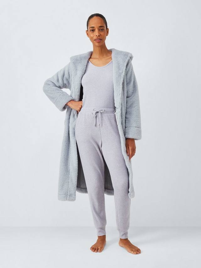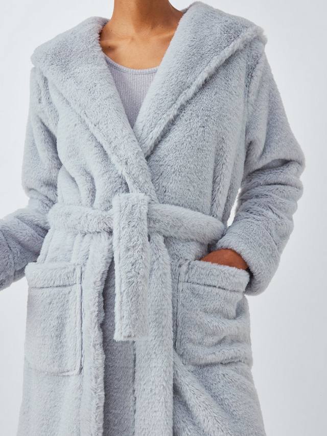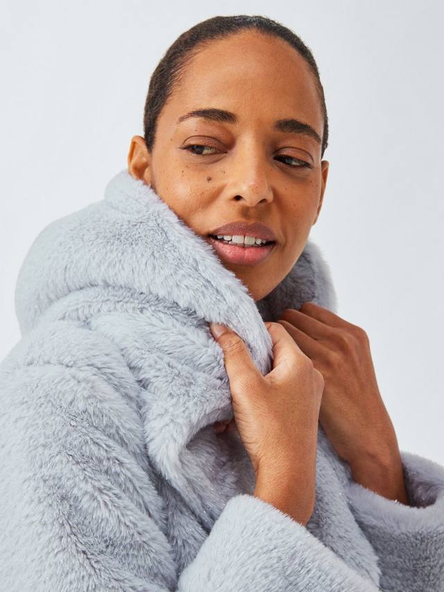 Этот халат с уютной и комфортной блестящей искусственной фактурой меха, в которую так приятно закутаться, имеет простой дизайн с поясом и карманами.