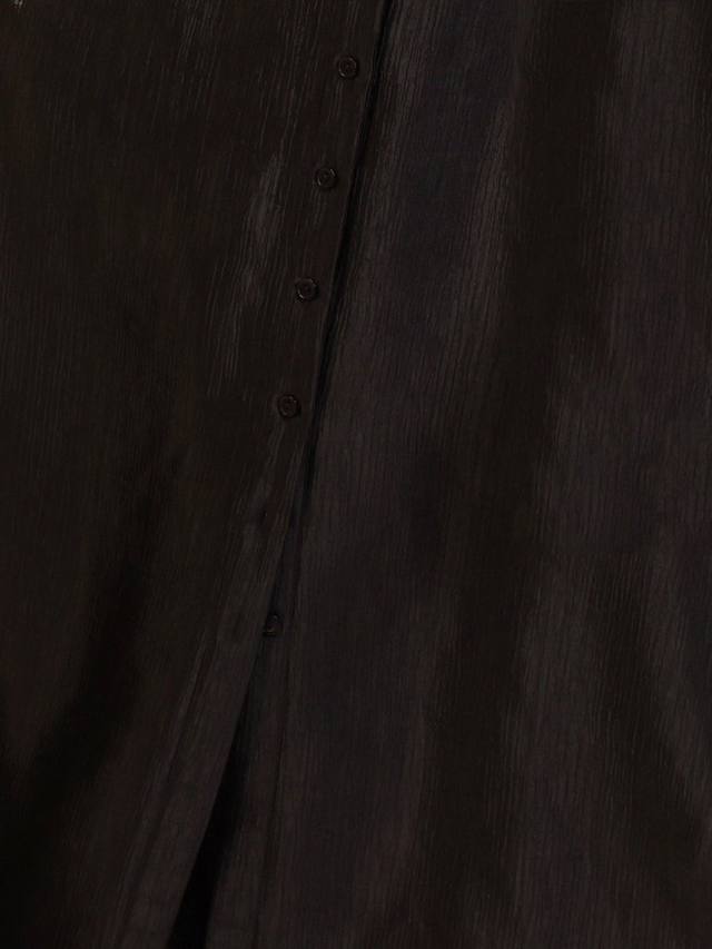 Эта блузка с длинными рукавами в стиле Новая романтика украшена красивым воротником-оборкой, следующим за вырезом, и потрясающим глубоким V-образным вырезом. Эластичные манжеты создают красивый, непринужденный образ на рукавах. Изготовлена из роскошной мягкой черной ткани.