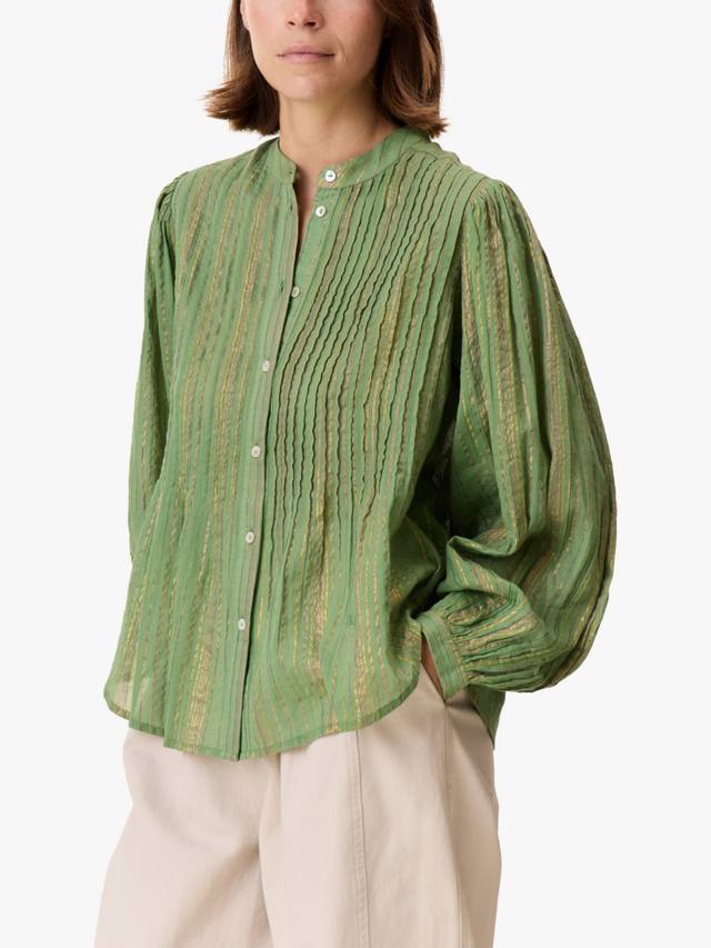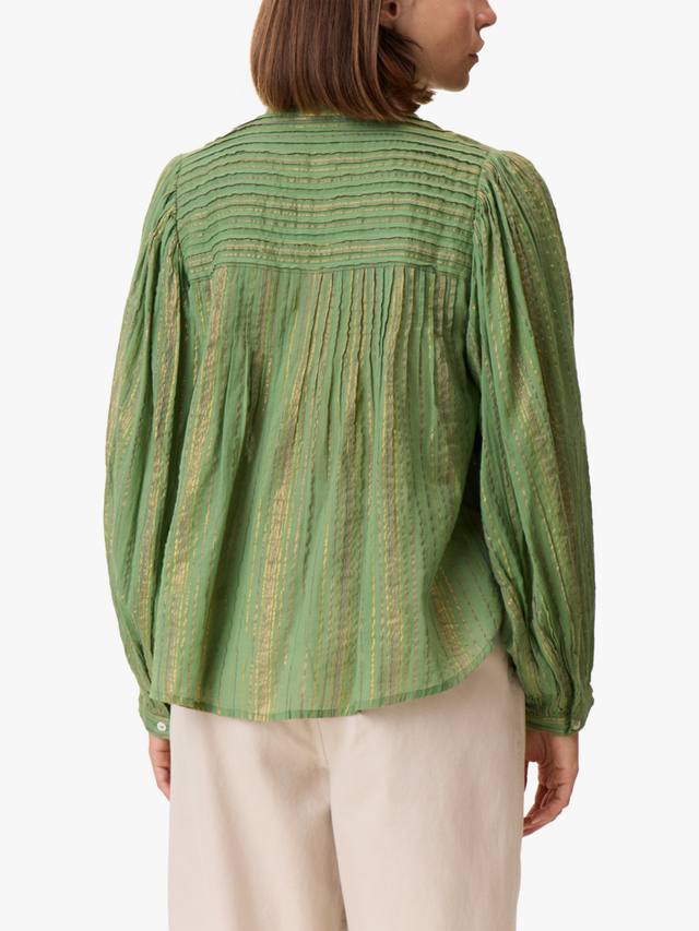 Металлические нити придают блеск этой блузке, украшенной плоскими складками и защипами для фактуры. Блузка изготовлена из легкой и дышащей хлопковой смесовой ткани, имеет воротник-стойку и рукава-блузон, что создает непринужденный силуэт.