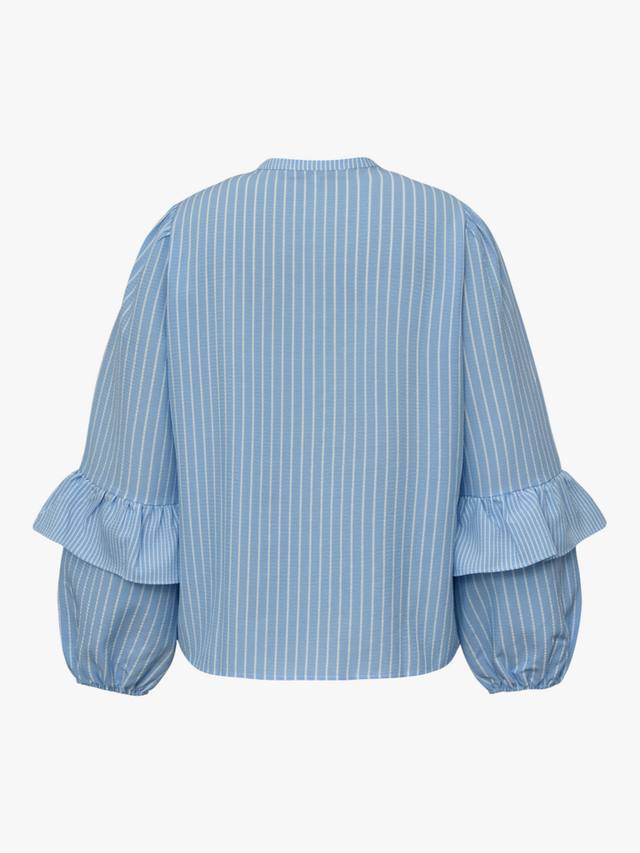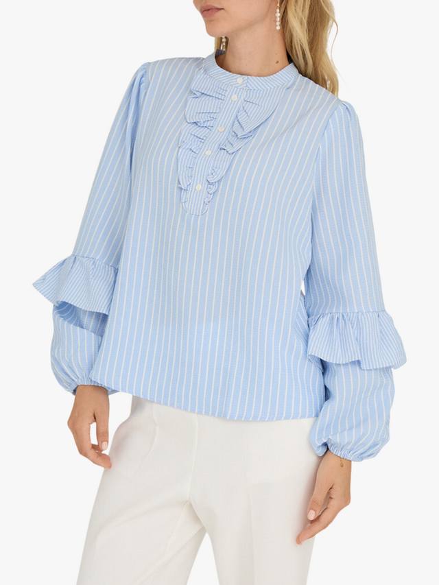Эта рубашка от A-VIEW, дополняющая вашу коллекцию, выгодно подчеркивает фигуру благодаря полосатому узору. Сохраняя классический крой с круглым вырезом и длинными рукавами, она выполнена из мягкой ткани с оборками на широких рукавах и кокетке.